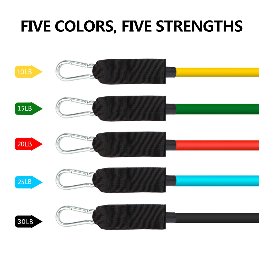 ADJUSTABLE RESISTANCE LEVELS: Each band is different in colors and resistance levels: Yellow - 10lbs, Blue - 15lbs, Red - 20lbs, Green - 25lbs, Black - 30lbs, with total resistance weight of 75lbs. You can adjust the tension intensity to achieve personal goals by applying a single band or combining multiple bands, perfect for beginners or professionals, men, women, teen or children.