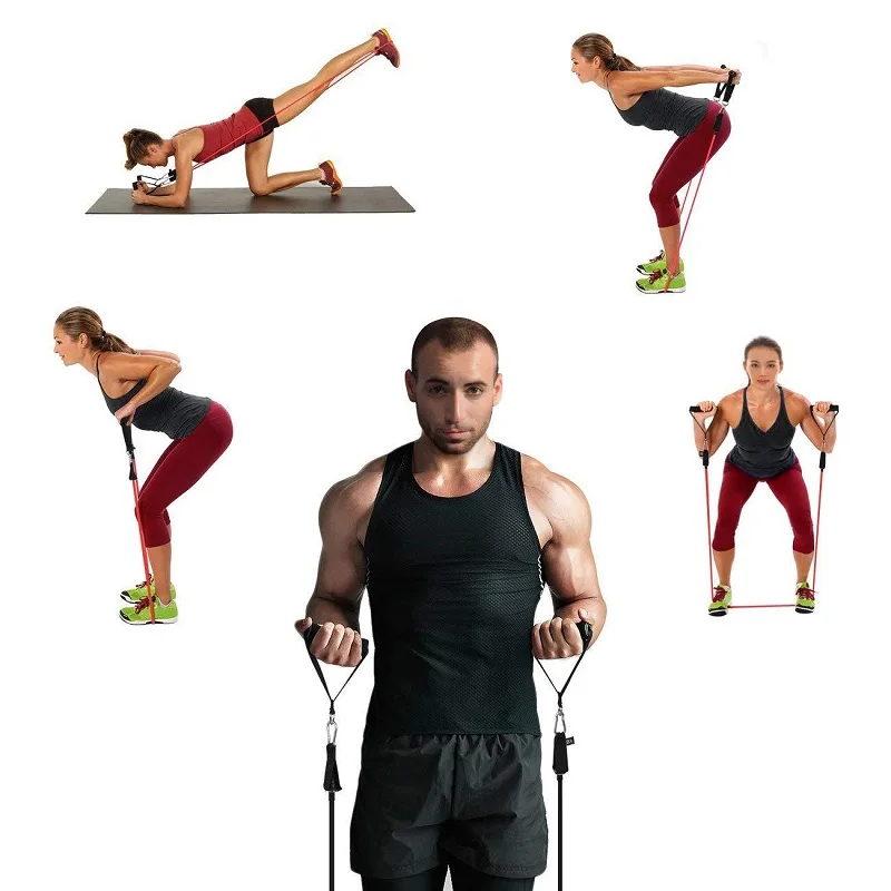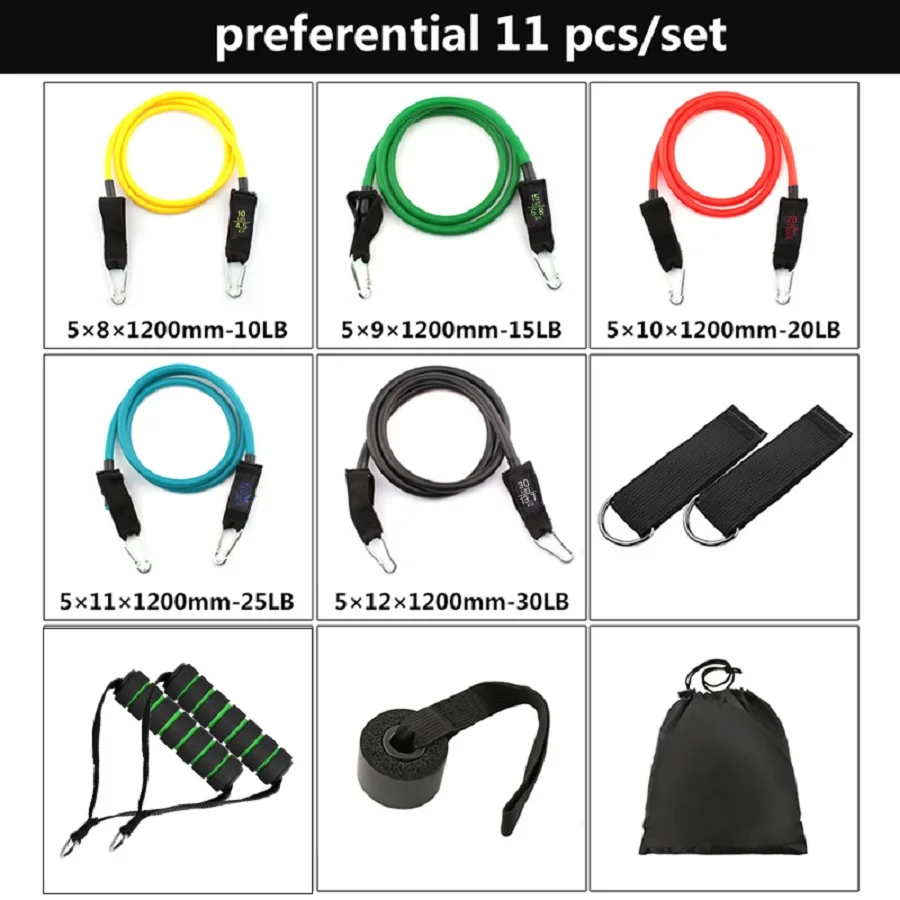 5pcs resistance bands,1pcs door anchor,1pcs carrying bag,2 pcs foam covered handles.2pcs ankle straps