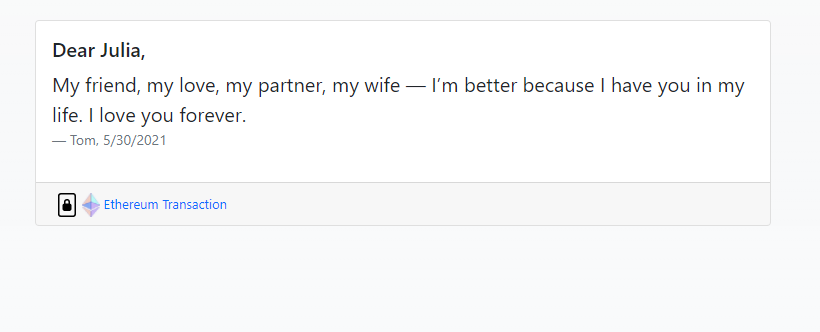 We thought it would be romantic to have people write eternity messages on the blockchain, for their loved ones. The same way people used to place love locks on bridges after getting rid of the key, or carve into trees. This gift will last forever.
